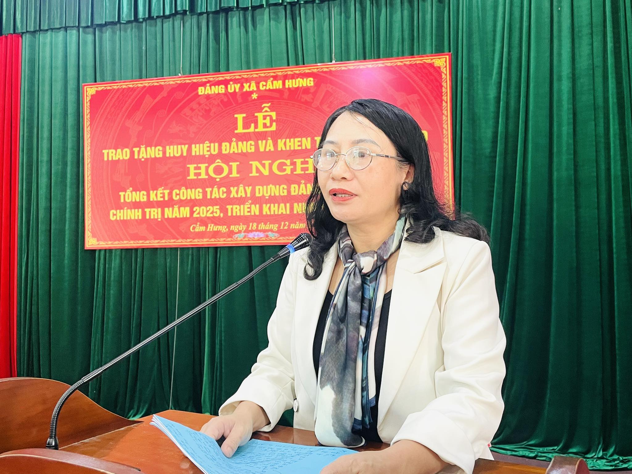 Phát biểu chỉ đạo tại hội nghị, đồng chí Nguyễn Thị Nhuần – Trưởng Ban Pháp chế Hội đồng nhân dân tỉnh đánh giá cao công tác chuẩn bị chu đáo, nghiêm túc; báo cáo tổng kết thẳng thắn, toàn diện; ghi nhận những kết quả nổi bật của Đảng bộ xã Cẩm Hưng, đặc biệt trong công tác tư tưởng, xây dựng khối đoàn kết, phát triển đảng viên, cải cách thủ tục hành chính, ứng phó kịp thời với thiên tai, bảo đảm quốc phòng – an ninh.