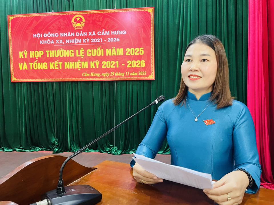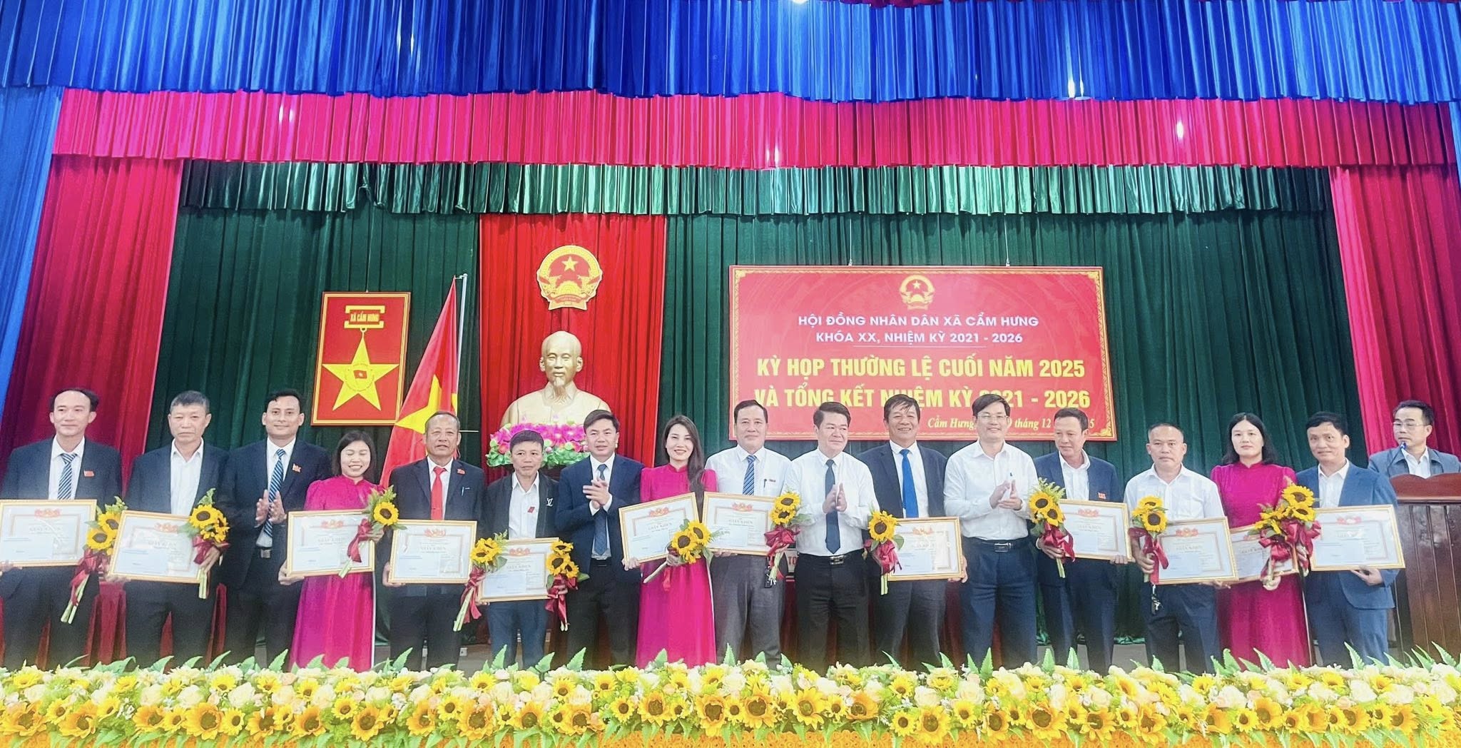 Cũng tại kỳ họp, Hội đồng nhân dân xã Cẩm Hưng khóa XX đã tổ chức biểu dương, khen thưởng 05 tập thể và 17 cá nhân có thành tích xuất sắc trong thực hiện nhiệm vụ nhiệm kỳ 2021–2026. Việc khen thưởng kịp thời thể hiện sự ghi nhận của cấp ủy, chính quyền địa phương đối với những nỗ lực, đóng góp của các tập thể, cá nhân; đồng thời góp phần động viên, khích lệ tinh thần trách nhiệm, phát huy vai trò nêu gương, tạo động lực tiếp tục thực hiện thắng lợi các nhiệm vụ chính trị trong thời gian tới.